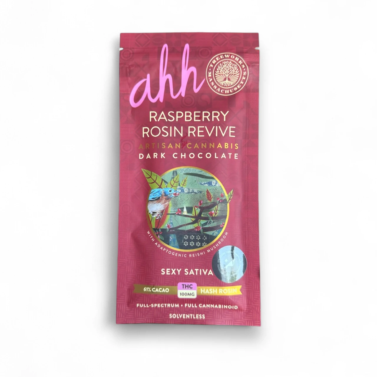 Raspberry Rosin Revive by Ahh Chocolates is a sativa-infused dark chocolate bar that combines rich 61% cocoa with real raspberries, offering a delightful burst of tart sweetness. Infused with award-winning Treeworks Hash Rosin, this handcrafted, small-batch edible provides a premium cannabis experience.