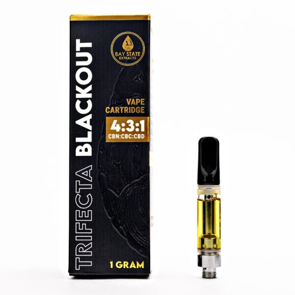 Trifecta Blackout CBD Cartridge - 1g by Bay State Hemp Co is a broad-spectrum CBD vape product designed to provide relaxation and calm. This cartridge features a unique blend of cannabinoids including CBN, CBC, and CBD in a 4:3:1 ratio, enhanced with a terpene profile rich in Limonene and E-Caryophyllene for a robust effect and flavor.