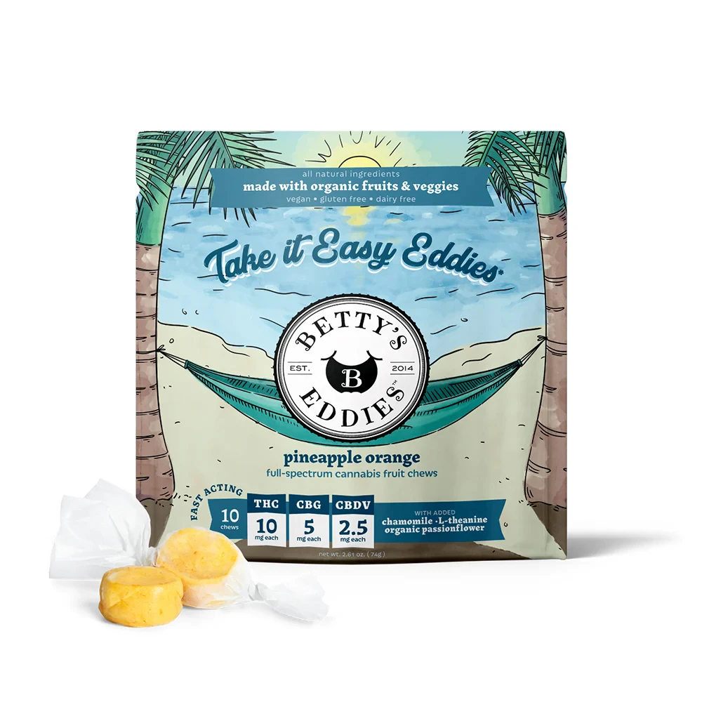 Pineapple Orange Bedtime Betty’s by Betty’s Eddies are handcrafted cannabis fruit chews infused with THC and CBG, specially formulated to promote relaxation and stress relief. Featuring tropical flavors and a blend of natural anxiety dampeners, these chews offer a soothing end- or start to your day.