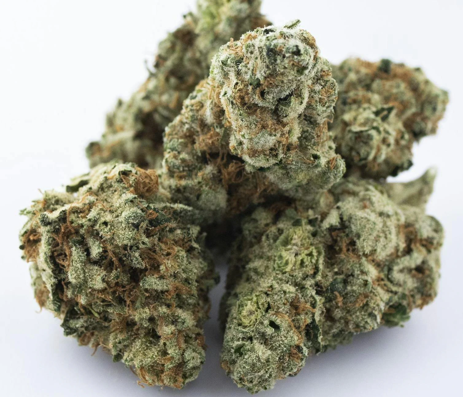 This strain features dense, bright neon green buds with red-orange hairs and purple-tinted trichomes, indicative of its potency and hybrid nature.