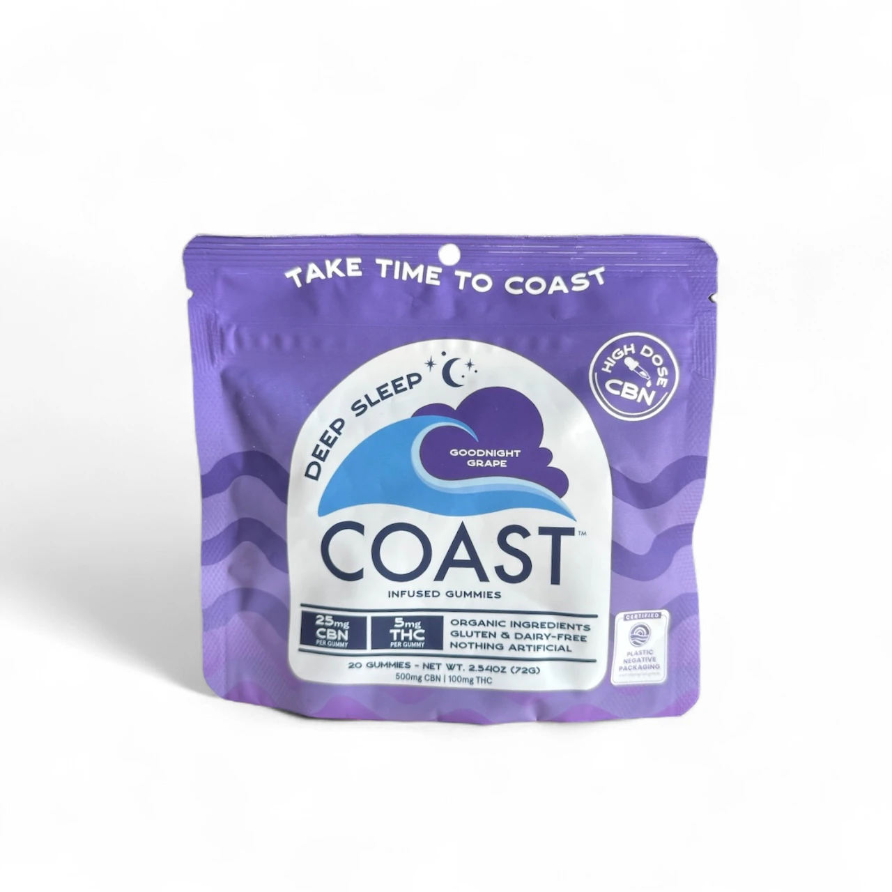 Goodnight Grape Gummies by Coast come in a 20-count package, with each gummy containing 25mg CBN and 5mg THC—totaling 500mg CBN and 100mg THC per pack. They are gluten-free, dairy-free, and made with organic ingredients, offering a clean and consistent nighttime edible.