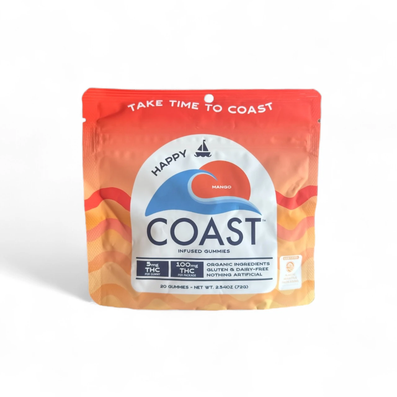 Mango Gummies by Coast Cannabis Co. come in a 20-count package, with each gummy containing 5mg of THC for a total of 100mg per pack. They are vegan, gluten-free, and crafted with organic ingredients to ensure a clean and consistent dose every time.