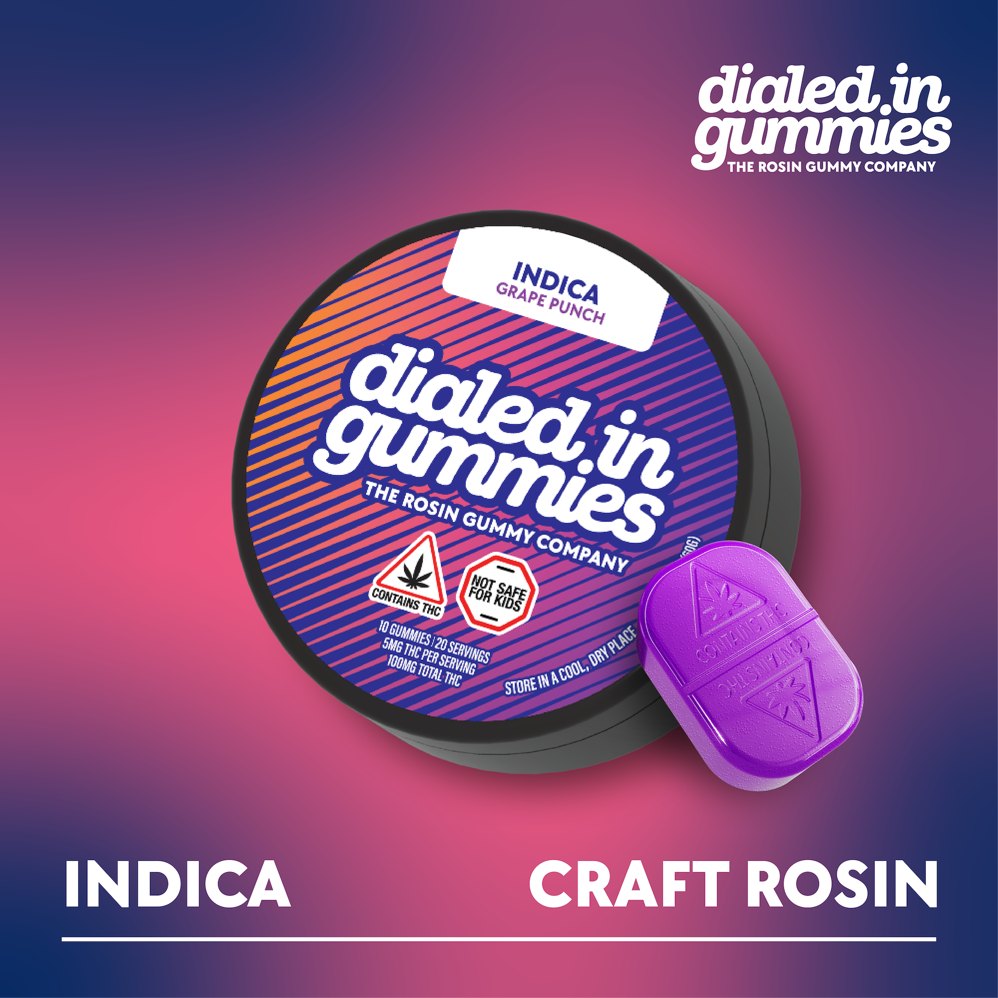 Grape Punch 100 mg Rosin Gummies by Dialed In Gummies are premium cannabis edibles infused with solventless live rosin to deliver a full‑spectrum experience wrapped in a sweet, fruity grape punch flavor profile. Many people find that Dialed In Gummies stand out for their craft approach and rich terpene expression, making them a favorite among edible enthusiasts.