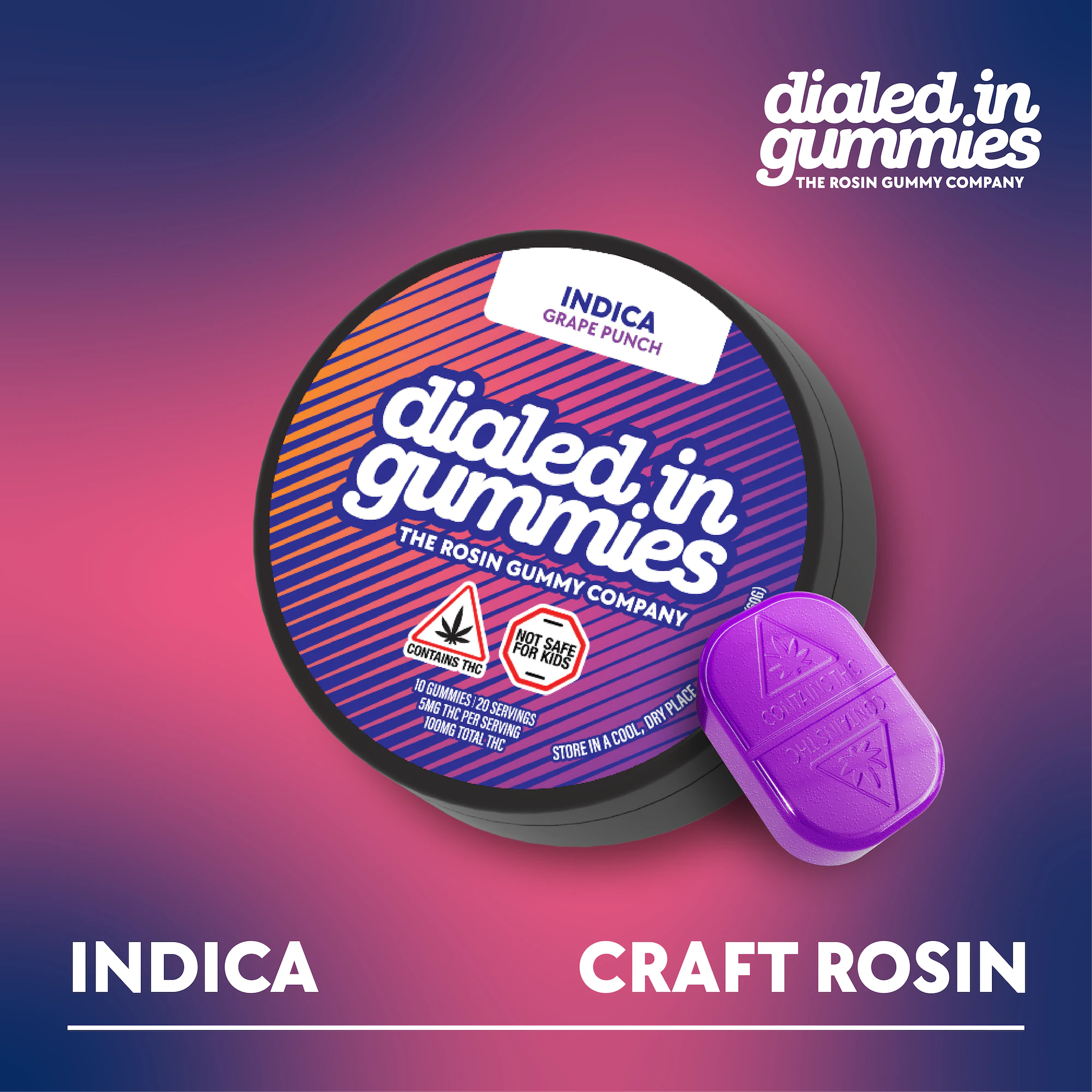 Grape Punch 100 mg Rosin Gummies by Dialed In Gummies typically come in a package containing multiple individual pieces, allowing for flexible dosing. The live rosin used in these gummies is sourced from select cannabis flower and infused using a careful process designed to retain natural terpenes and maximize flavor and effects. As with all edibles, it’s recommended to start with a low dose and wait to gauge effects before consuming more.