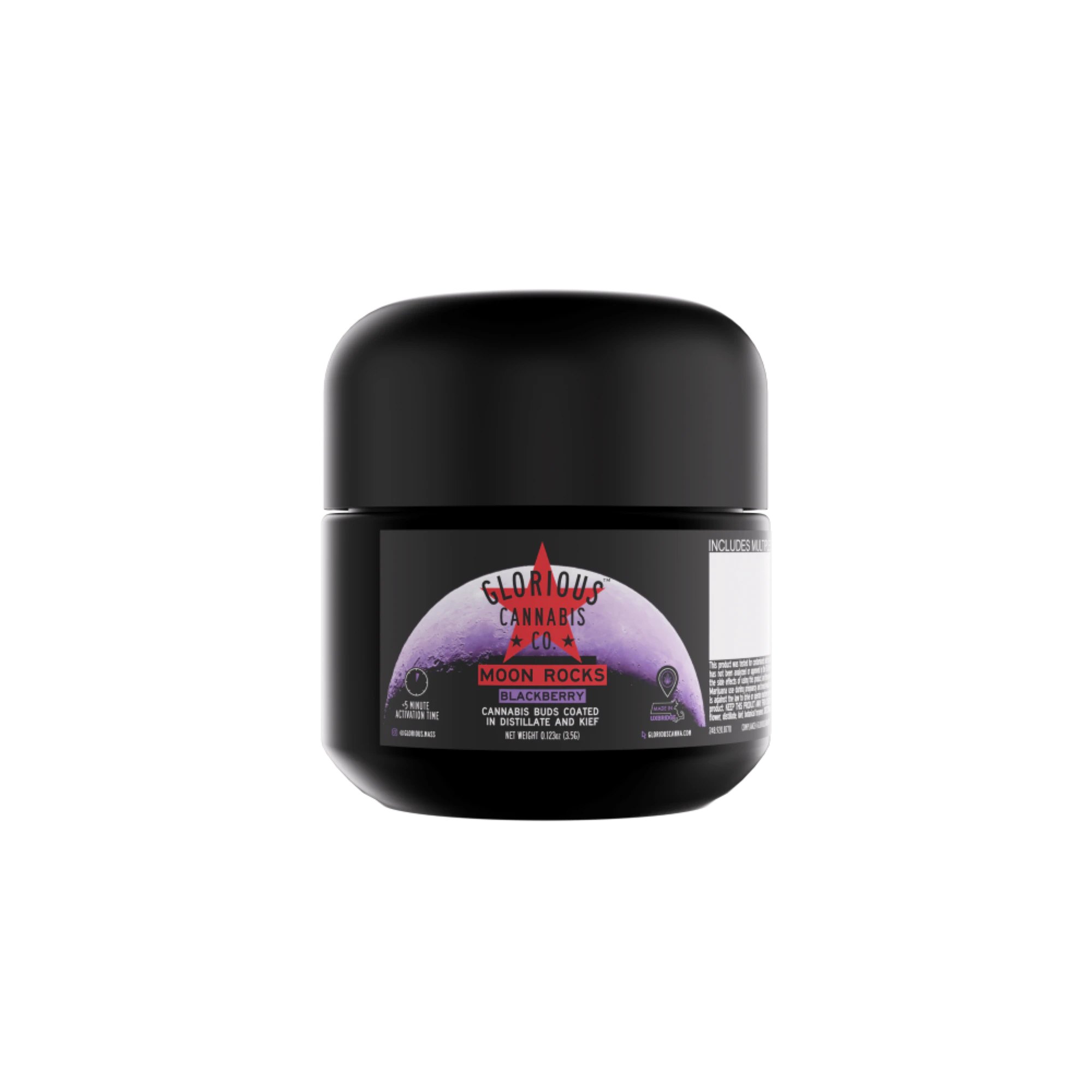 Glorious Cannabis moon rocks are carefully crafted by combining top-shelf flower with high-quality cannabis oil distillate and a sprinkle of kief, resulting in a potent and flavorful experience. This batch of sweet Blackberry offers an indica-hybrid experience.