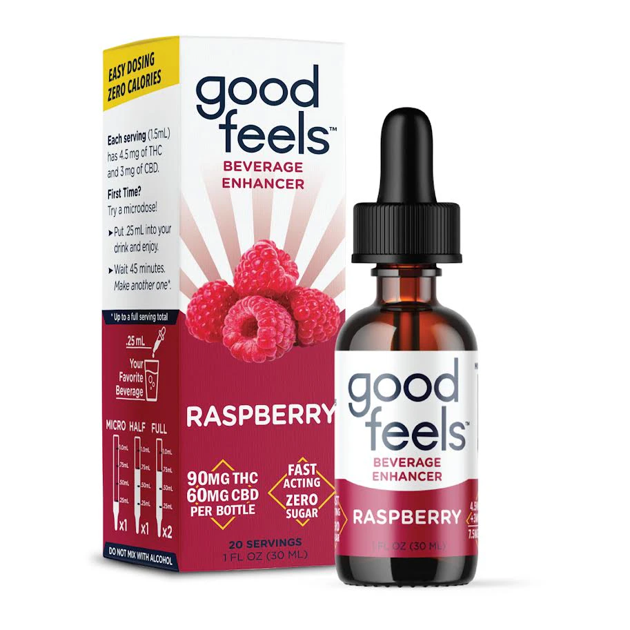The Good Feels Raspberry Beverage Enhancer is an innovative product designed to turn any drink into a cannabis-infused beverage. With 90mg of THC and 60mg of CBD, it offers a 3:2 entourage blend for a harmonious experience. The nano-particle cannabinoids used in this enhancer ensure it is nearly dissolvable in any liquid, making it fast-acting and allowing users to build their own desired cannabis experience.