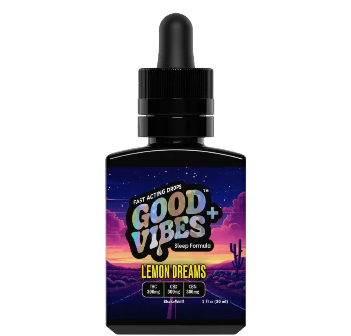 Lemon Dreams by Good Vibes is a THC syrup designed to promote restful sleep through a balanced blend of cannabinoids. Each 1 oz bottle contains 300mg each of THC, CBD, and CBN, formulated to support relaxation and restorative rest.