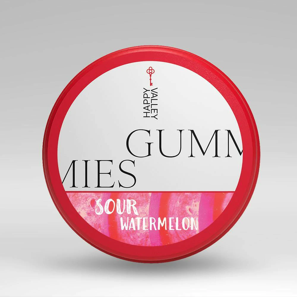 Sour Watermelon Gummies by Happy Valley are a 100 mg THC edible pack, containing 20 pieces with 5 mg THC per gummy. Made in Massachusetts kitchens, these gummies are gluten-free and crafted using hybrid distillate oil and all-natural ingredients—corn syrup, beet sugar, water, gelatin, potato starch, citric acid, coconut oil, along with natural colors and flavors .