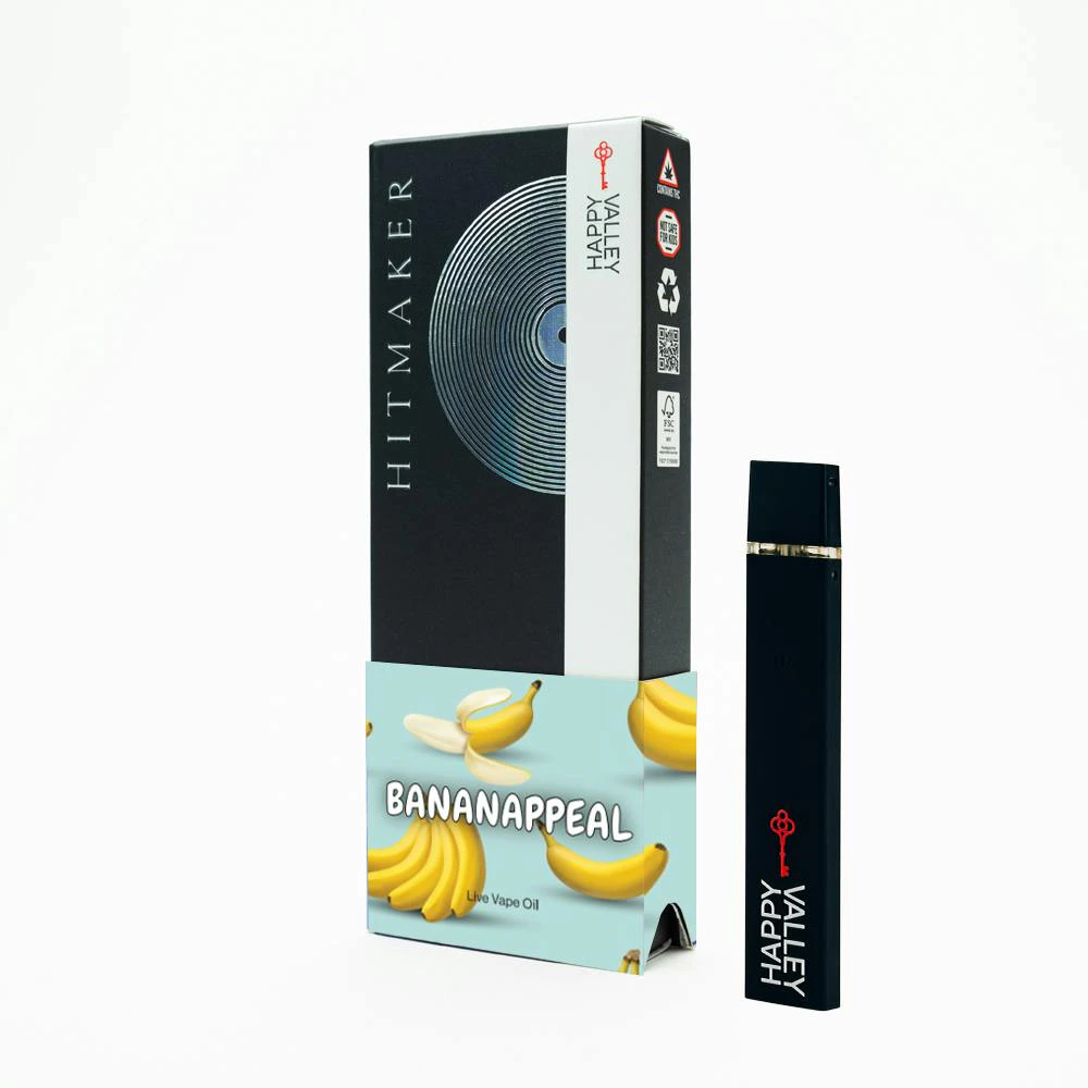 Bananappeal by Happy Valley is a 1g live vape oil disposable known for its sweet, creamy, and dessert-like flavor profile. This strain combines the essence of cookies and cream with a subtle hint of banana peel, delivering a smooth, buttery exhale that makes it feel like a treat for the senses.