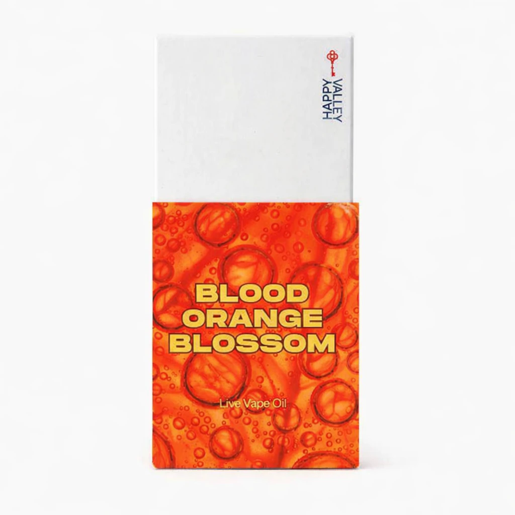 Blood Orange Blossom vape by Happy Valley is a unique blend derived from a mix of five different cultivars, masterfully combining the sweetness of ripe blood oranges with sophisticated herbal undertones. This vape experience is akin to a delicate mosaic of flavors, starting with a distinctly sweet and piney essence that smoothly transitions to reveal subtle notes of lavender and herbal tea upon exhale. The result is a balanced, nuanced, and bespoke vaping experience that truly captures the ephemeral beauty of flowers.