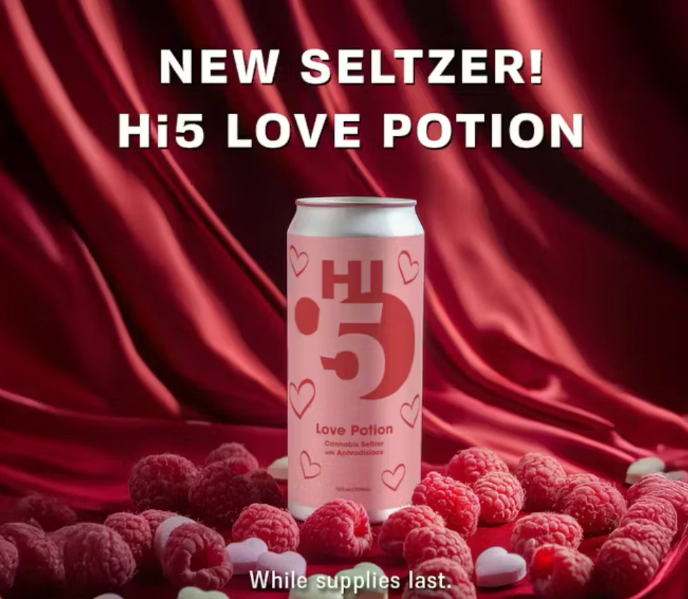 Hi5 Love Potion by Theory Wellness is a cannabis-infused beverage designed to deliver a fast-acting and flavorful experience. This seltzer blends raspberry and schisandra berries with aphrodisiacs; maca root, damania leaf, horny goat weed, muria puama, ashwagandha creating a refreshing and subtly tart drink perfect for any occasion.