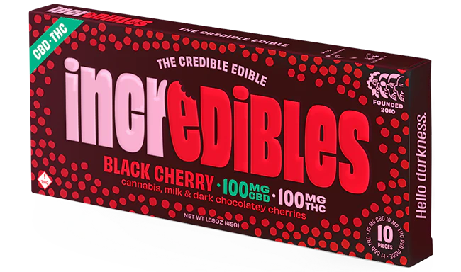 Incredibles Black Cherry + CBD 1:1 Chocolate Bar is a cannabis-infused edible crafted with a blend of tart black cherry and smooth, rich chocolate, offering a balanced and enjoyable experience designed to delight the senses.