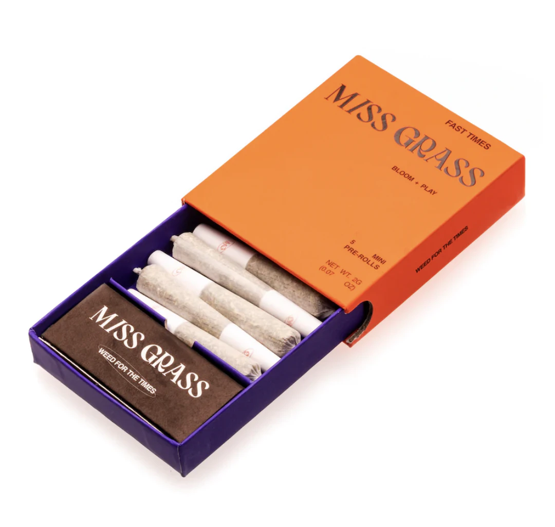 Miss Grass Fast Times Minis is a sativa-dominant preroll designed to enhance moments of bloom and play. This pack includes five 0.4g mini pre-rolls, along with a matchbox, all neatly packaged in a compact box for convenience.