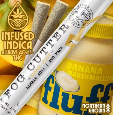 Northern Grown’s Fog Cutter line features hydro-infused pre-rolls, and the Banana Fluff edition comes in a convenient two‑pack, each joint infused with live terps and crafted for a consistent experience. Perfect for anyone seeking a sweet, nostalgic treat that blends relaxation with tasty enjoyment.
