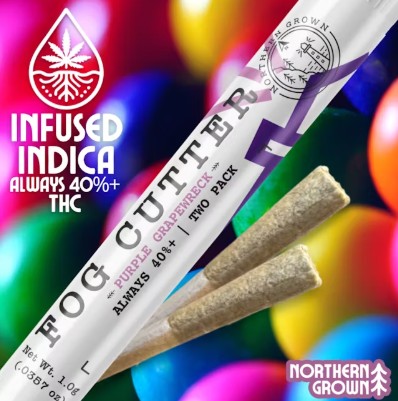 Purple Grape Wreck Fog Cutters by Northern Grown is an indica-hybrid infused preroll known for its bold flavor and potent effects. Each package contains two half-gram prerolls infused with high-potency distillate extract and enhanced with a precise blend of natural and live terpenes, delivering a robust and flavorful smoking experience.