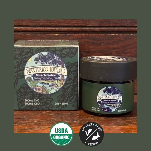 Sweetgrass Botanicals' Muscle Salve is an award-winning topical formulated with a balanced 1:1 ratio of 300mg THC and 300mg CBD. Crafted by Vermont clinical herbalist Lyndsay Rose, this 2oz salve combines solventless hash and full-spectrum CBD with a blend of anti-inflammatory botanicals.