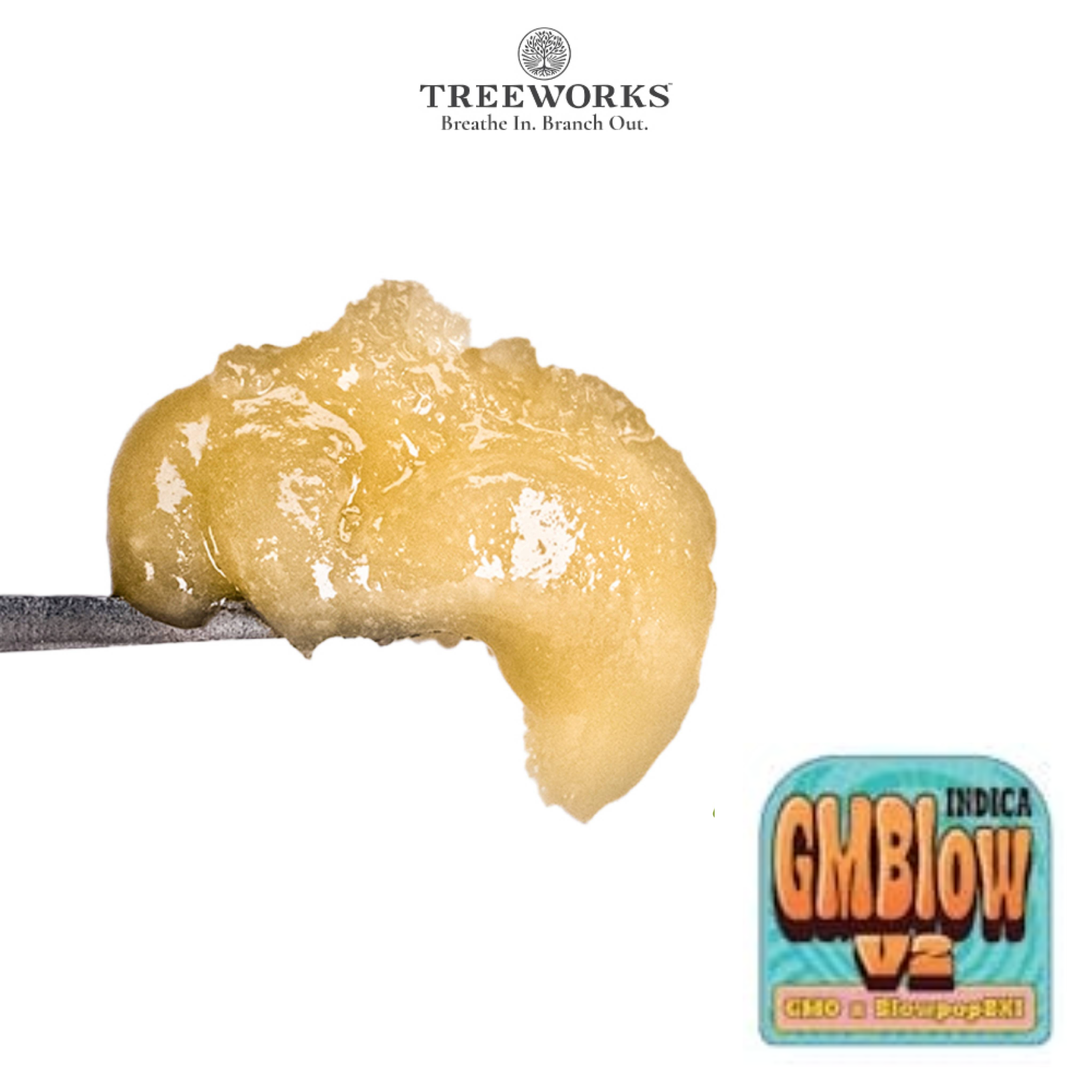 GMBlow V2 by Treeworks is an indica-leaning hybrid live rosin jam crafted from a cross between GMO and BlowPopsBx1. This live rosin jam is part of Treeworks' solventless line, known for its purity and full-spectrum effects.