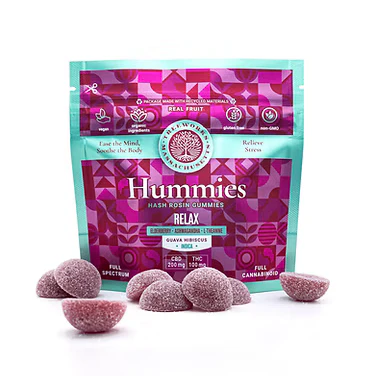 Relax Hummies by Treeworks are indica-leaning hash rosin gummies crafted to ease both body and mind. Infused with a blend of elderberry, ashwagandha, and L-theanine, these edibles are designed to promote calm and tranquility.